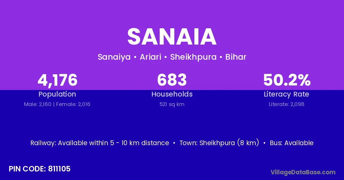 Sheikhpura (8 km) is the nearest town to Sanaia village for major economic activities and is located approximately 8 km away.