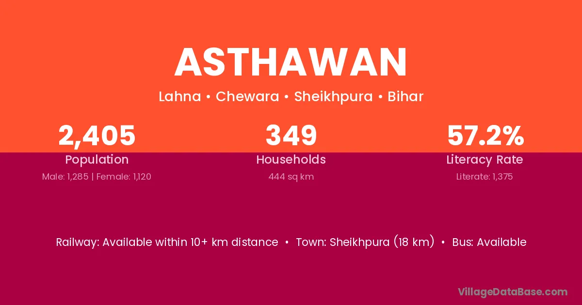 Sheikhpura (18 km) is the nearest town to Asthawan village for major economic activities and is located approximately 18 km away.