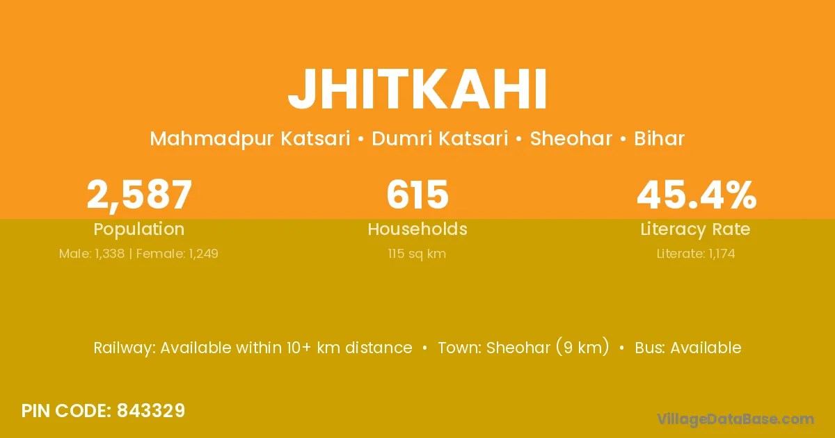Sheohar (9 km) is the nearest town to Jhitkahi village for major economic activities and is located approximately 9 km away.