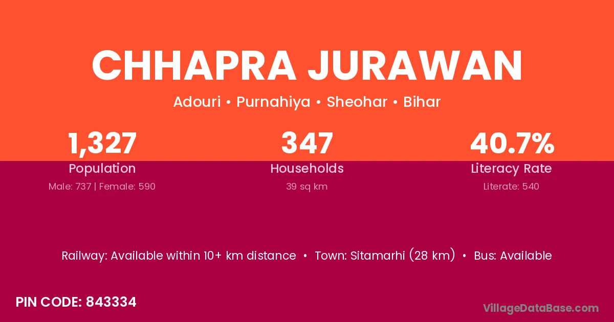 Sitamarhi (28 km) is the nearest town to Chhapra Jurawan village for major economic activities and is located approximately 28 km away.