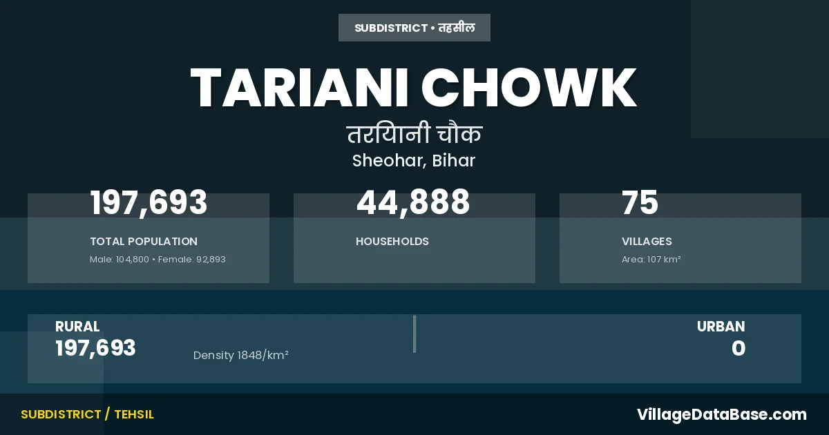 According to the 2011 census The total area of Tariani Chowk Subdivision is 107 km², with a population of 197693 people. The population density is 1,848 inhabitants per square kilometre, and there are approximately 44888 houses in the sub district.