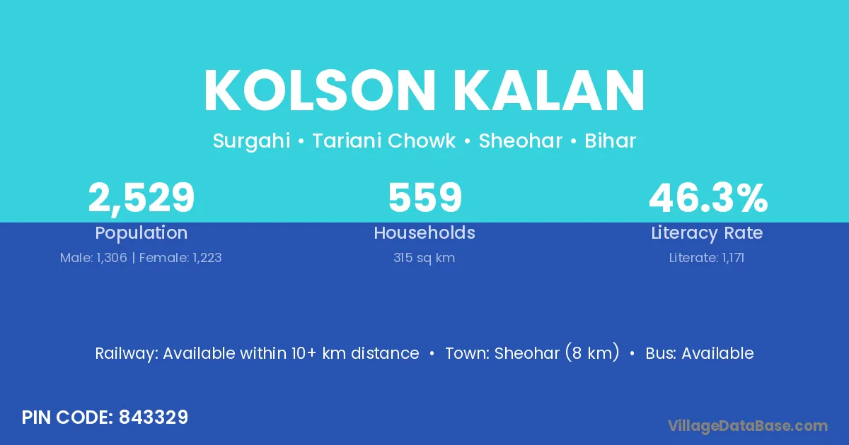 Sheohar (8 km) is the nearest town to Kolson Kalan village for major economic activities and is located approximately 8 km away.