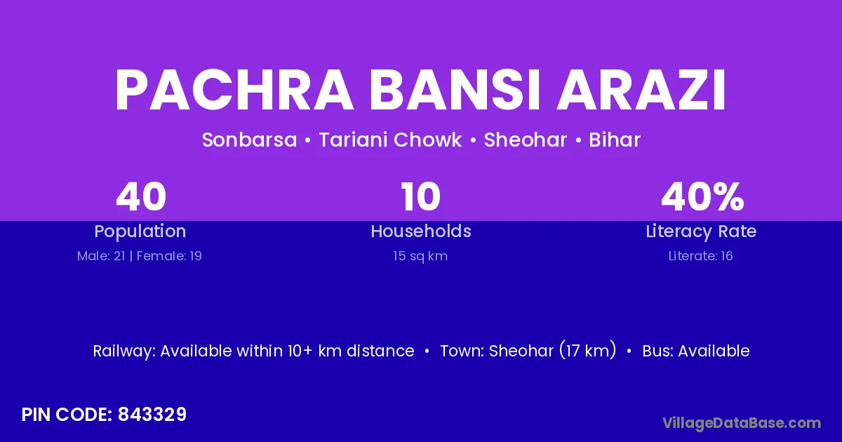 Sheohar (17 km) is the nearest town to Pachra Bansi Arazi village for major economic activities and is located approximately 17 km away.