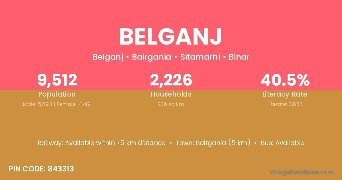 Bairgania (5 km) is the nearest town to Belganj village for major economic activities and is located approximately 5 km away.
