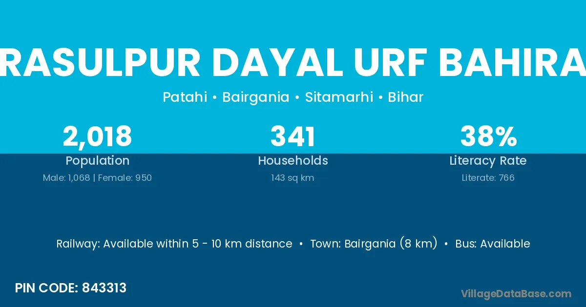 Bairgania (8 km) is the nearest town to Rasulpur Dayal Urf Bahira village for major economic activities and is located approximately 8 km away.