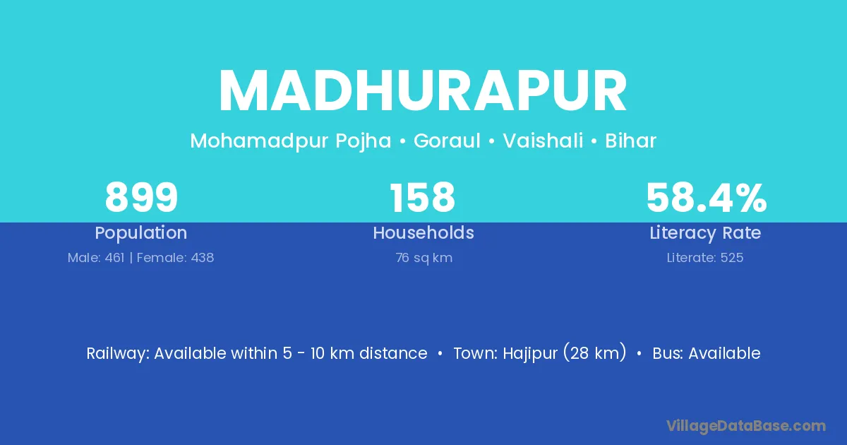 Sitamarhi (16 km) is the nearest town to Madhurapur village for major economic activities and is located approximately 16 km away.