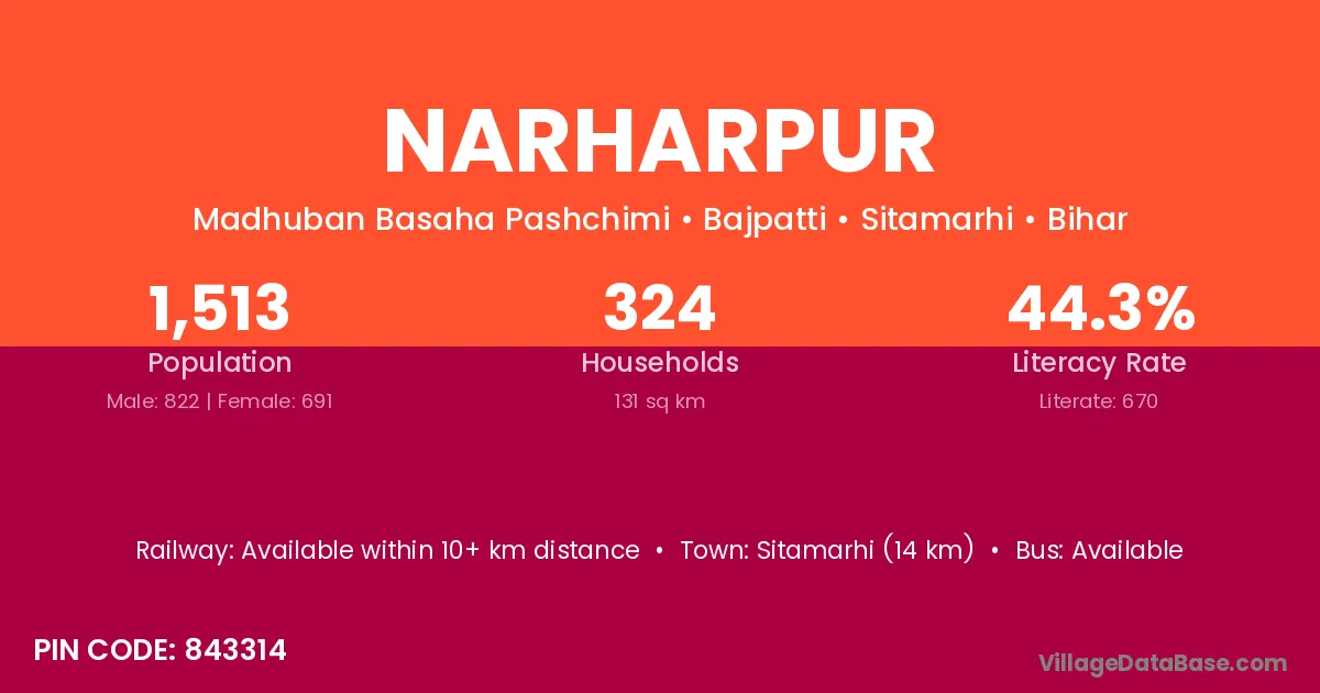 Sitamarhi (14 km) is the nearest town to Narharpur village for major economic activities and is located approximately 14 km away.