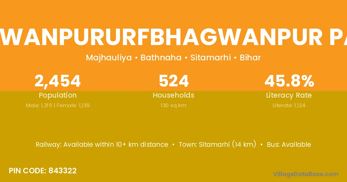 Sitamarhi (14 km) is the nearest town to Bhagwanpururfbhagwanpur Patahi village for major economic activities and is located approximately 14 km away.