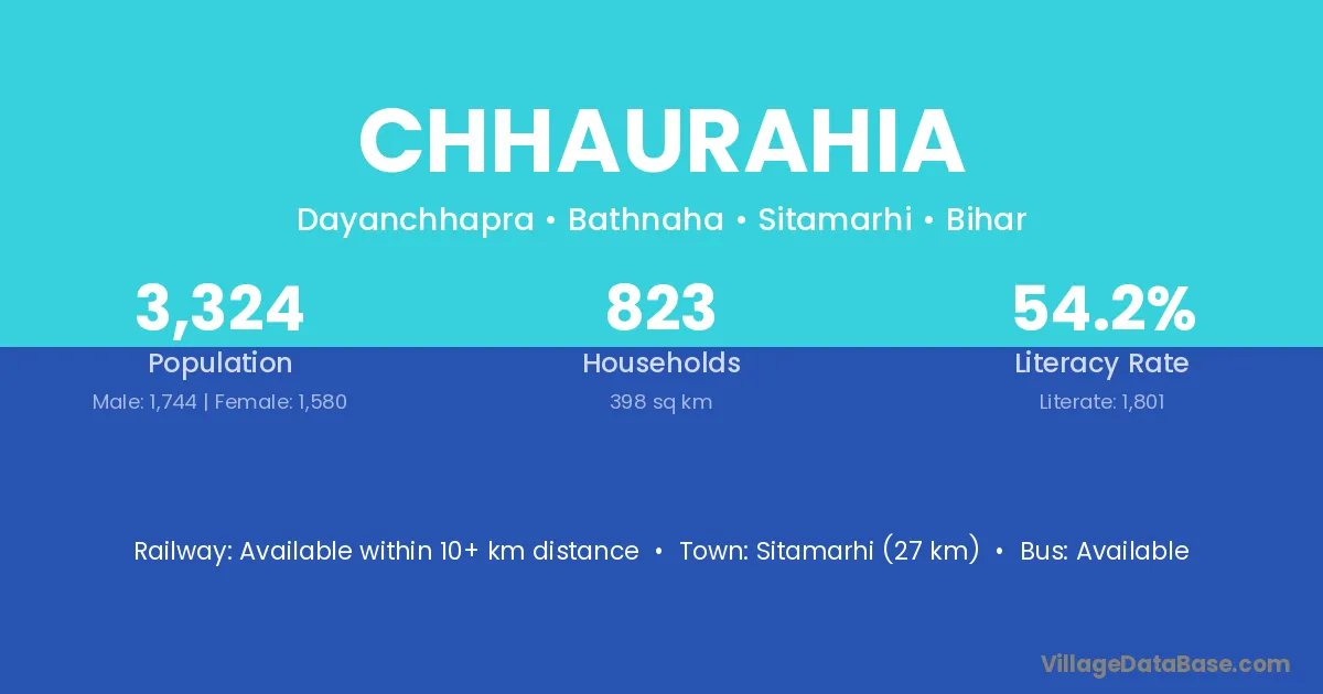Sitamarhi (27 km) is the nearest town to Chhaurahia village for major economic activities and is located approximately 27 km away.