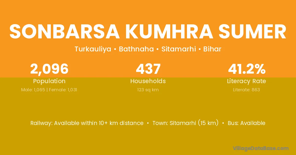 Sitamarhi (15 km) is the nearest town to Sonbarsa Kumhra Sumer village for major economic activities and is located approximately 15 km away.