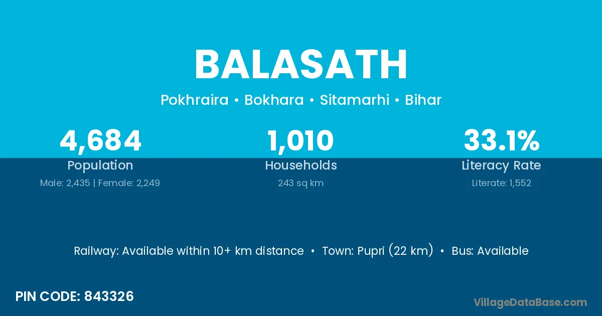 Pupri (22 km) is the nearest town to Balasath village for major economic activities and is located approximately 22 km away.