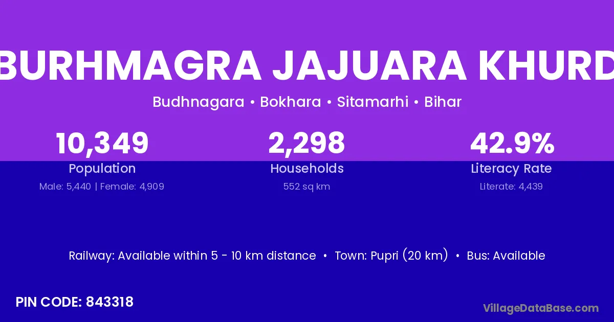 Burhmagra Jajuara Khurd village has a total population of 10,349 people, of which 5,440 are males and 4,909 are females.