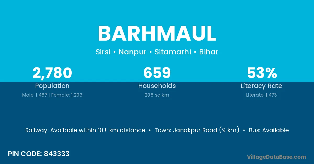 Janakpur Road (9 km) is the nearest town to Barhmaul village for major economic activities and is located approximately 9 km away.