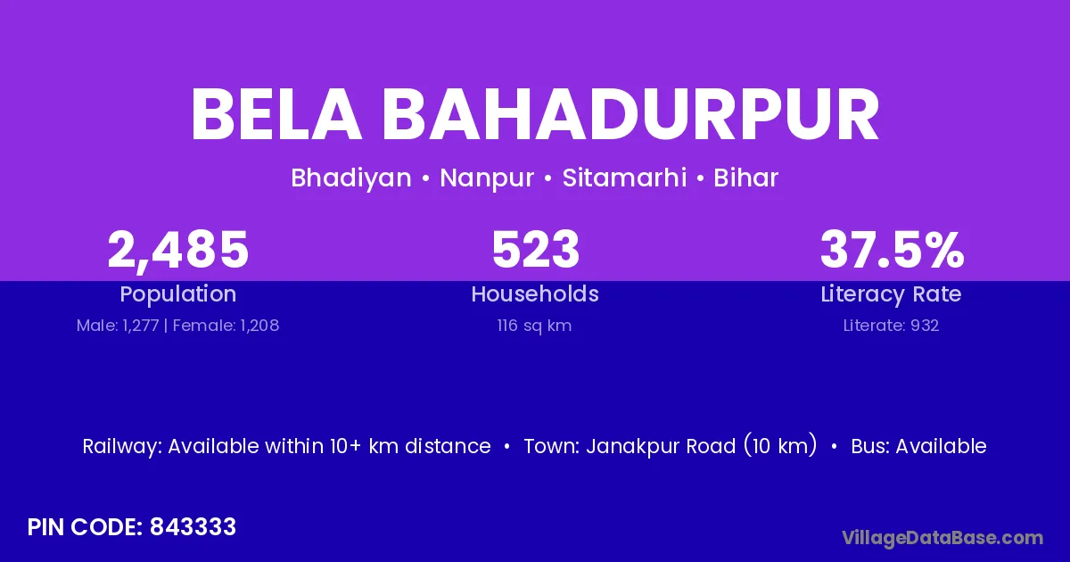 Bela Bahadurpur village has a total population of 2,485 people, of which 1,277 are males and 1,208 are females.