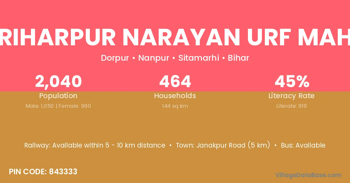 Janakpur Road (5 km) is the nearest town to Hariharpur Narayan Urf Mahua village for major economic activities and is located approximately 5 km away.