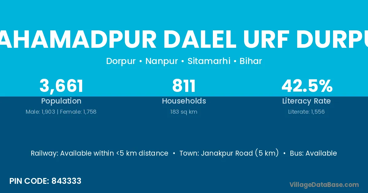 Janakpur Road (5 km) is the nearest town to Mahamadpur Dalel Urf Durpur village for major economic activities and is located approximately 5 km away.