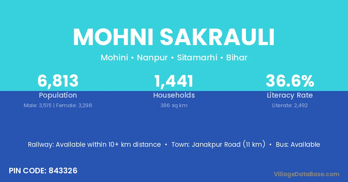 Janakpur Road (11 km) is the nearest town to Mohni Sakrauli village for major economic activities and is located approximately 11 km away.