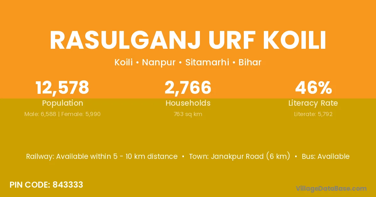 Janakpur Road (6 km) is the nearest town to Rasulganj Urf Koili village for major economic activities and is located approximately 6 km away.