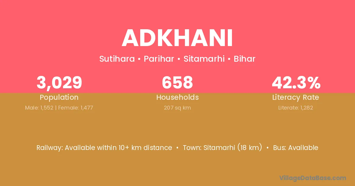 Sitamarhi (18 km) is the nearest town to Adkhani village for major economic activities and is located approximately 18 km away.