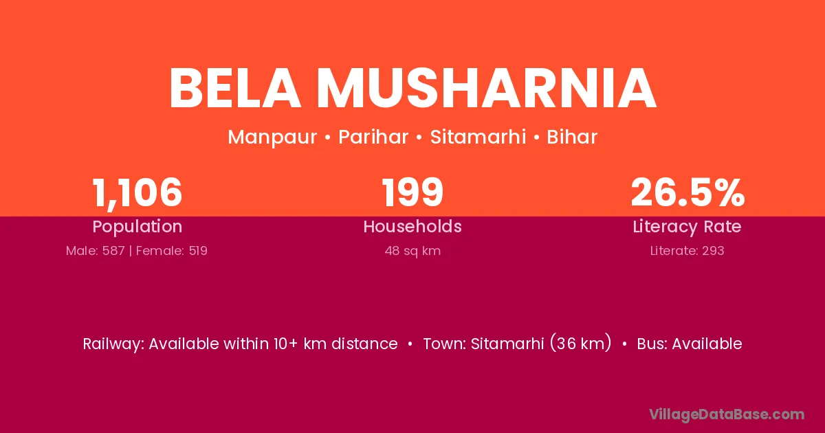 Sitamarhi (36 km) is the nearest town to Bela Musharnia village for major economic activities and is located approximately 36 km away.