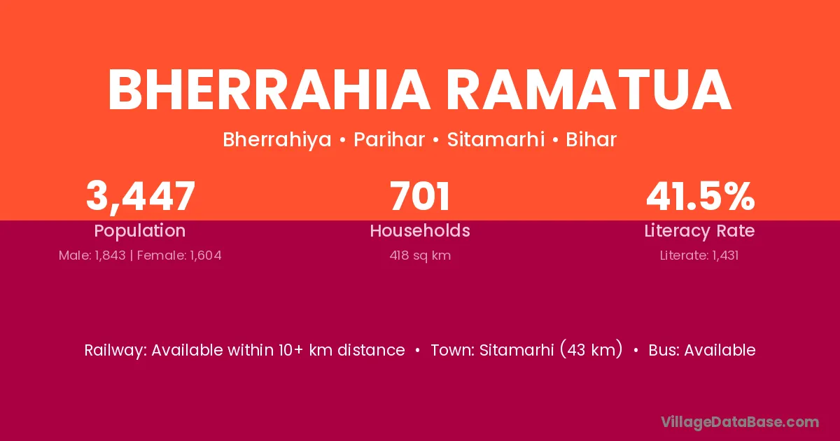 Bherrahia Ramatua village has a total population of 3,447 people, of which 1,843 are males and 1,604 are females.