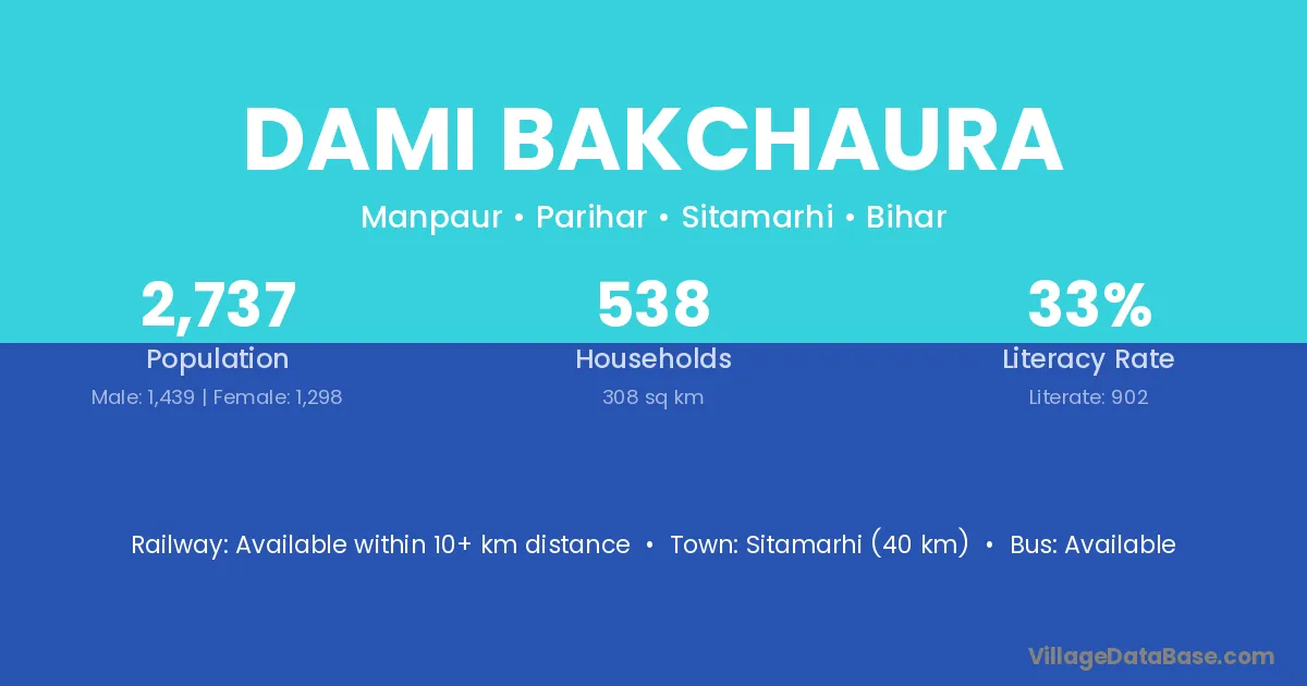 Sitamarhi (40 km) is the nearest town to Dami Bakchaura village for major economic activities and is located approximately 40 km away.