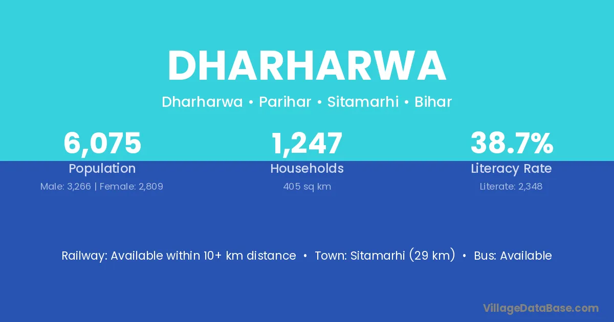 Sitamarhi (29 km) is the nearest town to Dharharwa village for major economic activities and is located approximately 29 km away.
