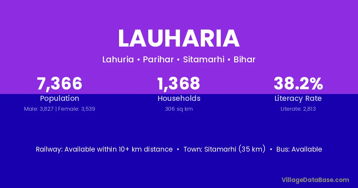 Sitamarhi (35 km) is the nearest town to Lauharia village for major economic activities and is located approximately 35 km away.