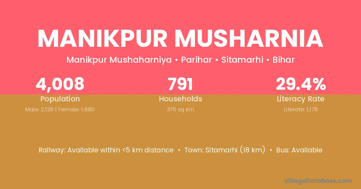 Sitamarhi (18 km) is the nearest town to Manikpur Musharnia village for major economic activities and is located approximately 18 km away.