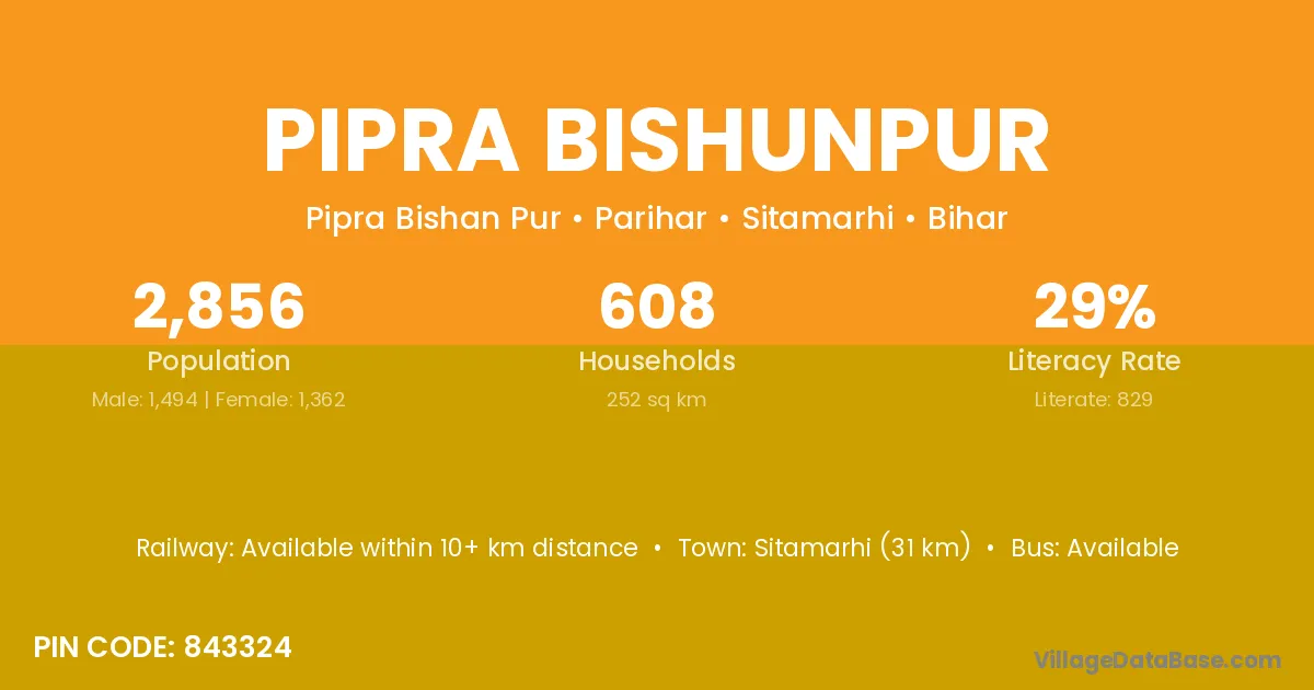 Sitamarhi (31 km) is the nearest town to Pipra Bishunpur village for major economic activities and is located approximately 31 km away.