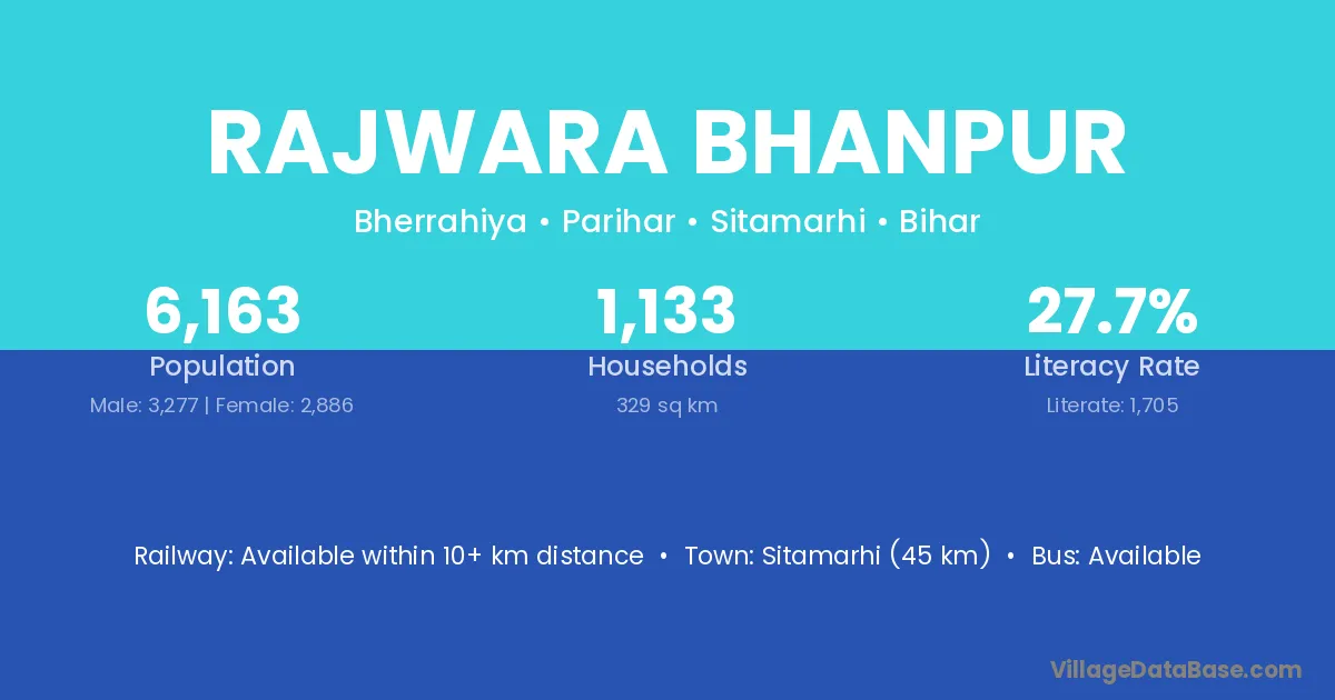 Sitamarhi (45 km) is the nearest town to Rajwara Bhanpur village for major economic activities and is located approximately 45 km away.