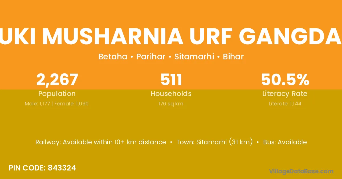 Sitamarhi (31 km) is the nearest town to Suki Musharnia Urf Gangdah village for major economic activities and is located approximately 31 km away.
