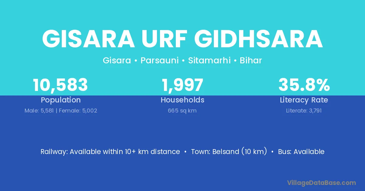 Belsand (10 km) is the nearest town to Gisara Urf Gidhsara village for major economic activities and is located approximately 10 km away.