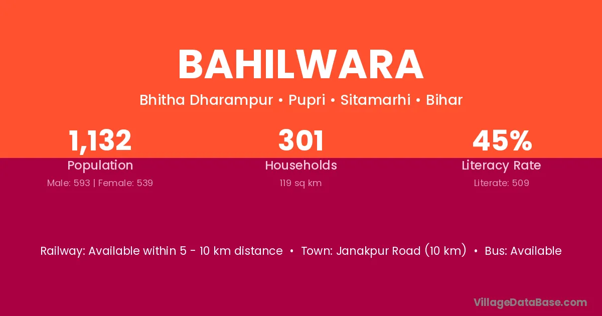 Janakpur Road (10 km) is the nearest town to Bahilwara village for major economic activities and is located approximately 10 km away.