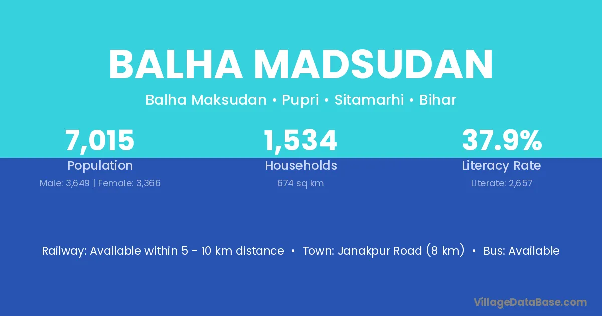 Janakpur Road (8 km) is the nearest town to Balha Madsudan village for major economic activities and is located approximately 8 km away.