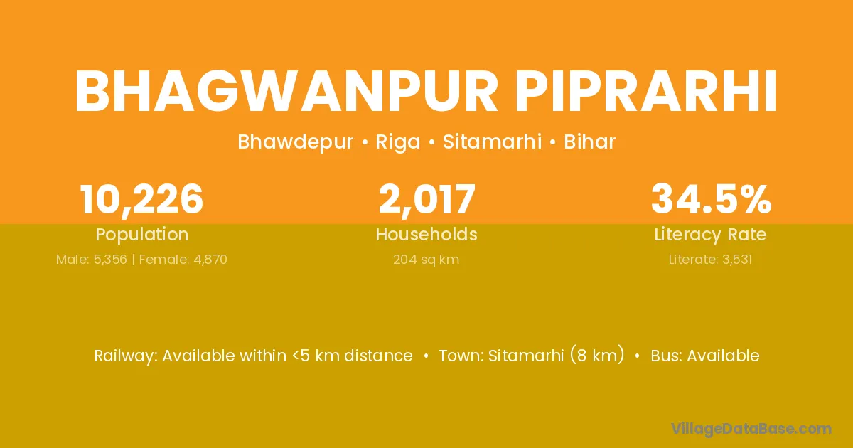 Sitamarhi (8 km) is the nearest town to Bhagwanpur Piprarhi village for major economic activities and is located approximately 8 km away.