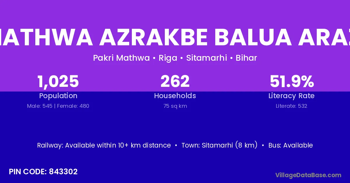 Mathwa Azrakbe Balua Arazi village has a total population of 1,025 people, of which 545 are males and 480 are females.