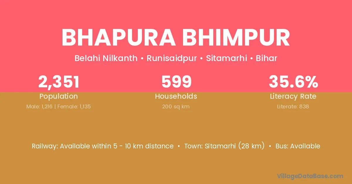 Sitamarhi (28 km) is the nearest town to Bhapura Bhimpur village for major economic activities and is located approximately 28 km away.