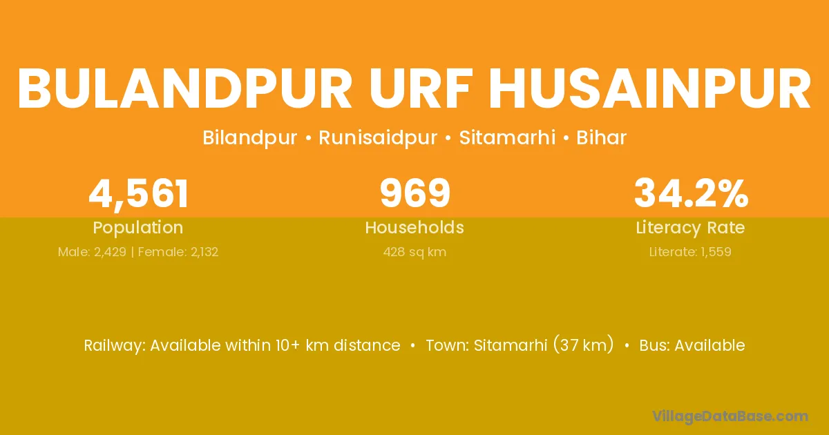 Sitamarhi (37 km) is the nearest town to Bulandpur Urf Husainpur village for major economic activities and is located approximately 37 km away.
