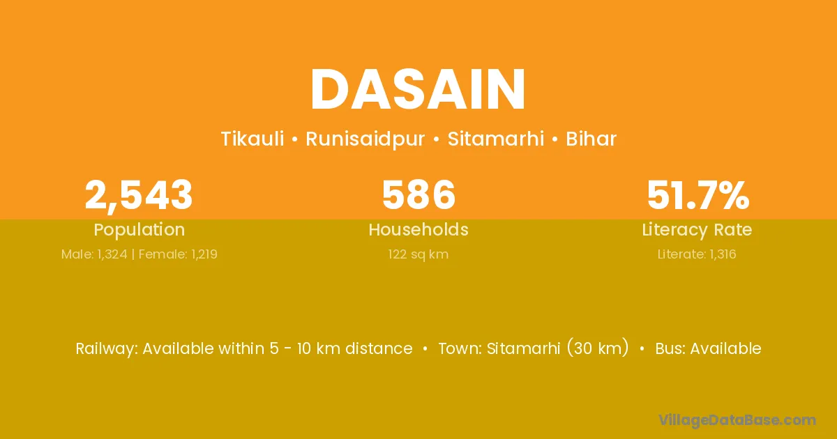 Sitamarhi (30 km) is the nearest town to Dasain village for major economic activities and is located approximately 30 km away.