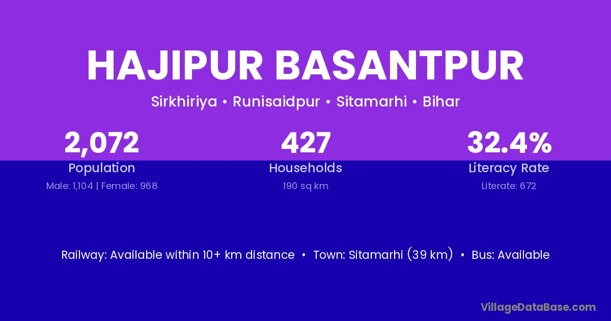 Sitamarhi (39 km) is the nearest town to Hajipur Basantpur village for major economic activities and is located approximately 39 km away.
