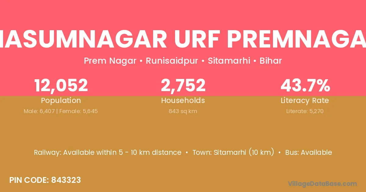 Sitamarhi (10 km) is the nearest town to Masumnagar Urf Premnagar village for major economic activities and is located approximately 10 km away.