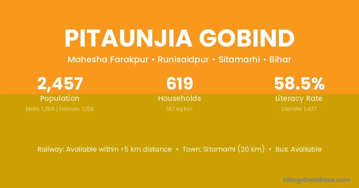 Sitamarhi (20 km) is the nearest town to Pitaunjia Gobind village for major economic activities and is located approximately 20 km away.