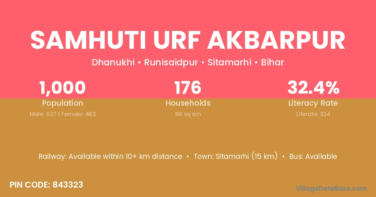 Sitamarhi (15 km) is the nearest town to Samhuti Urf Akbarpur village for major economic activities and is located approximately 15 km away.
