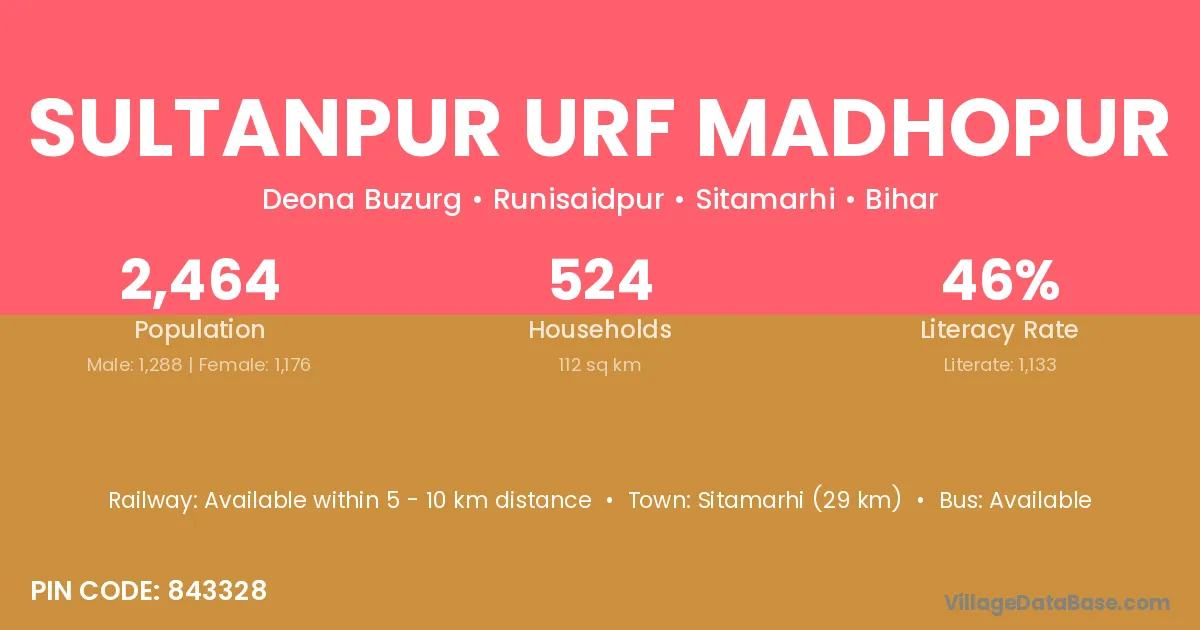 Sitamarhi (29 km) is the nearest town to Sultanpur Urf Madhopur village for major economic activities and is located approximately 29 km away.