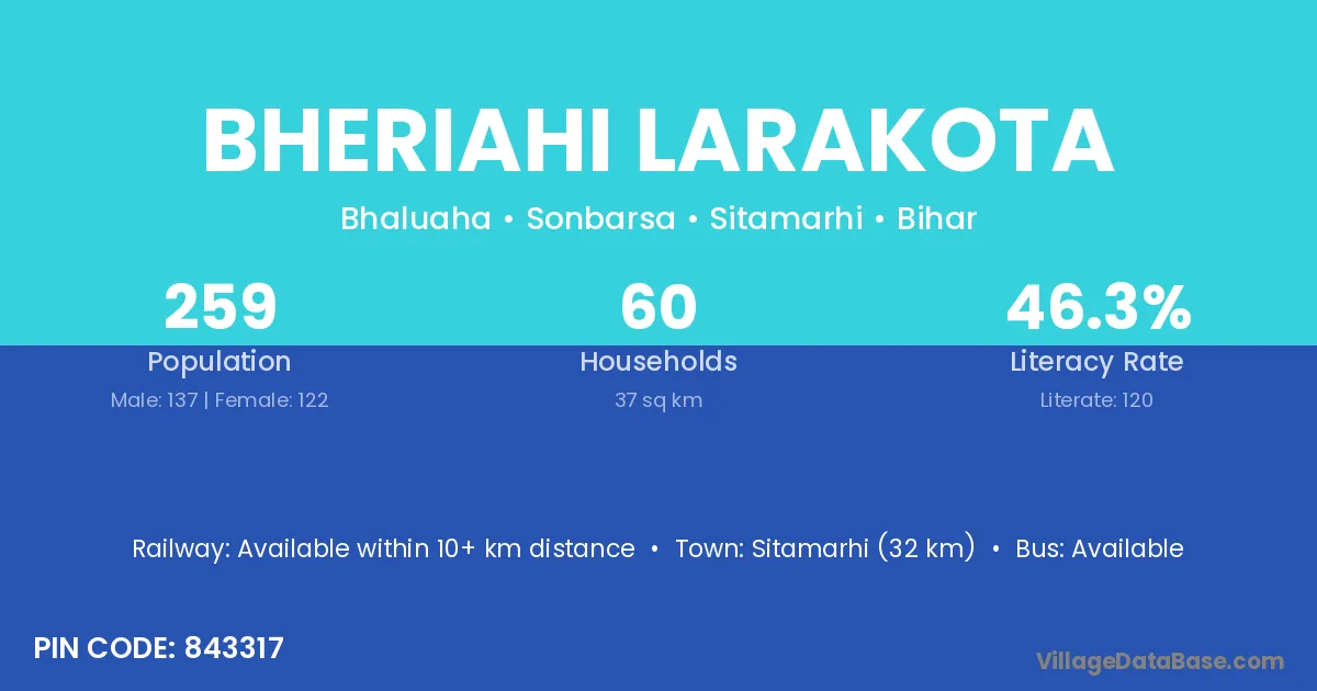 Sitamarhi (32 km) is the nearest town to Bheriahi Larakota village for major economic activities and is located approximately 32 km away.