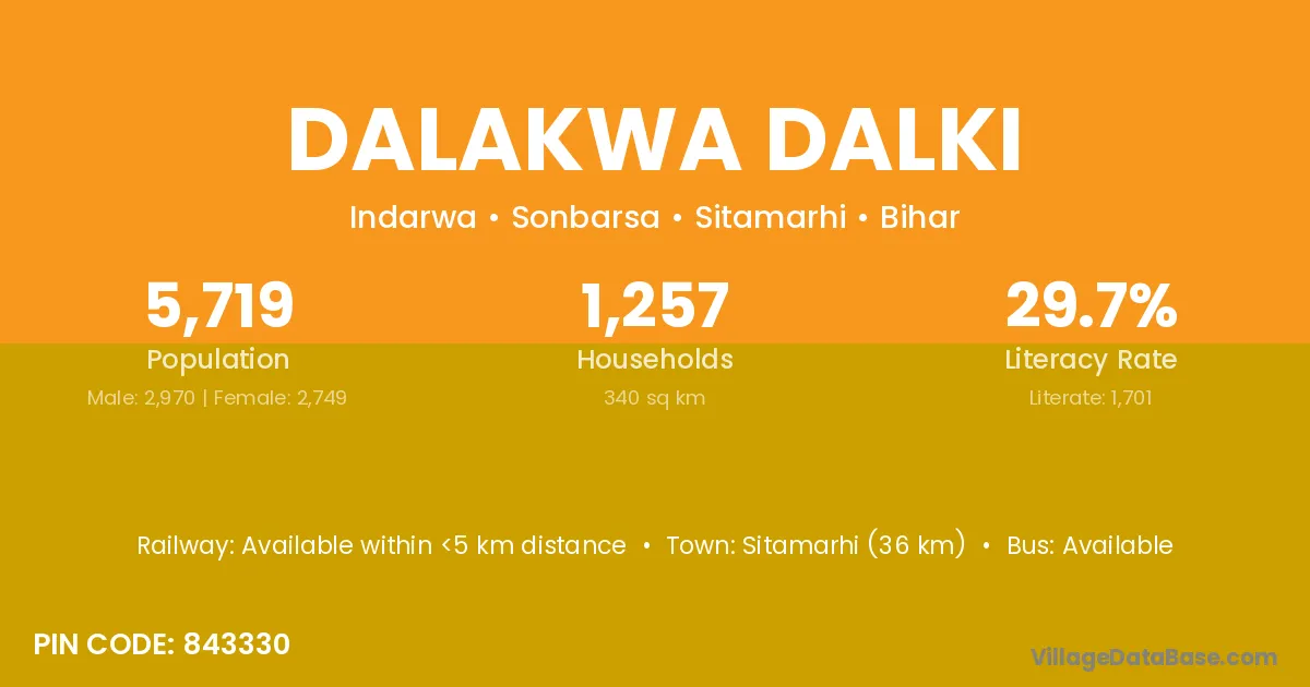 Sitamarhi (36 km) is the nearest town to Dalakwa Dalki village for major economic activities and is located approximately 36 km away.