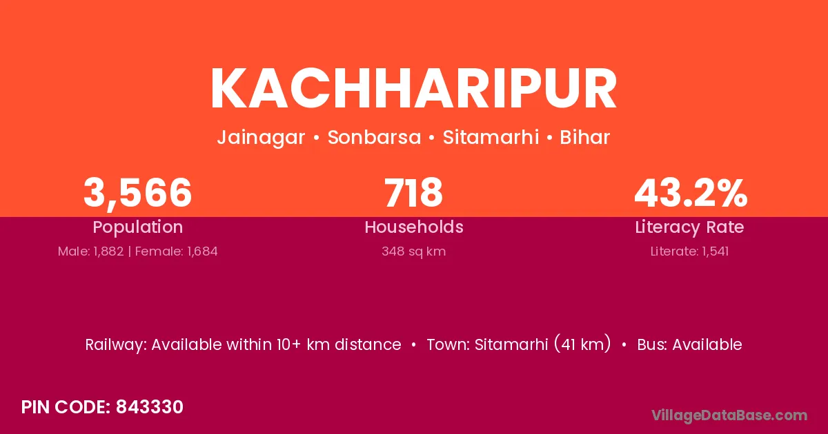 Sitamarhi (41 km) is the nearest town to Kachharipur village for major economic activities and is located approximately 41 km away.