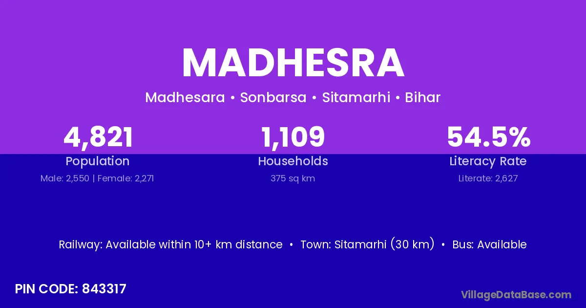 Sitamarhi (30 km) is the nearest town to Madhesra village for major economic activities and is located approximately 30 km away.