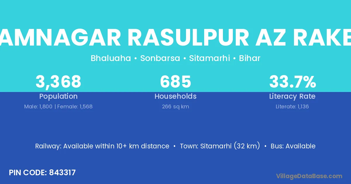 Sitamarhi (32 km) is the nearest town to Ramnagar Rasulpur Az Rakbe village for major economic activities and is located approximately 32 km away.